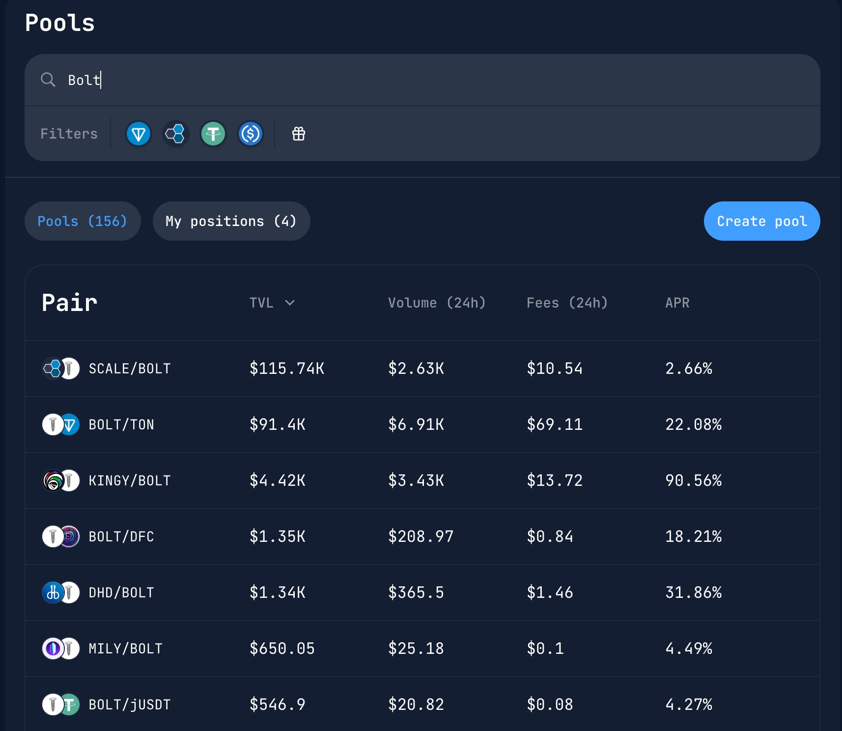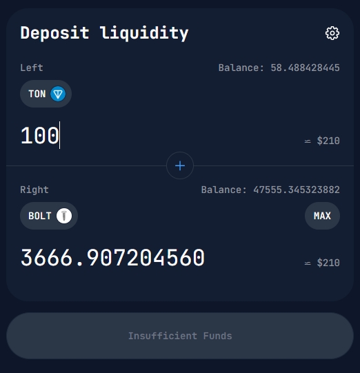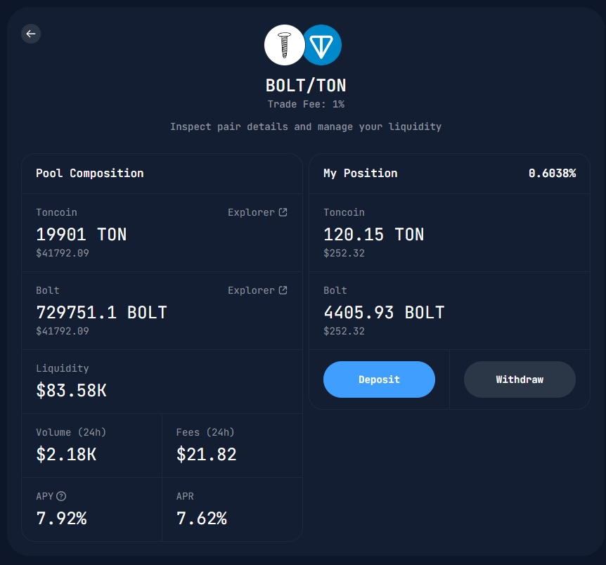 By investing liquidity in BOLT/TON or any other pair, you can start earning on commissions. Since your share will be in the common pool where trades are executed, you - as a liquidity provider can earn on commissions that DeDust transfers to liquidity providers for securing trades.